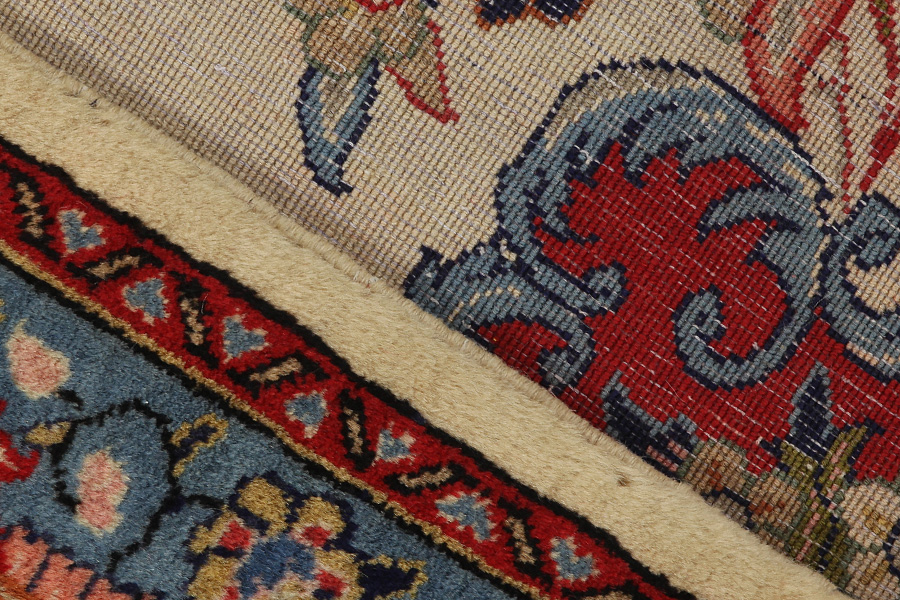 Abrash: Due to the different amount of grease in the wool and the added salt during the process of dyeing, the wool has got a varying colour absorbance. This is not very visible before weaving. During the weaving though, lines of the same colour are formed in the rug. This is called Abrash (which in Farsi means little cloud) and it shows that the wool was not manufactured using chemical means and marks the naturalness and authenticity of the rugs. Examples