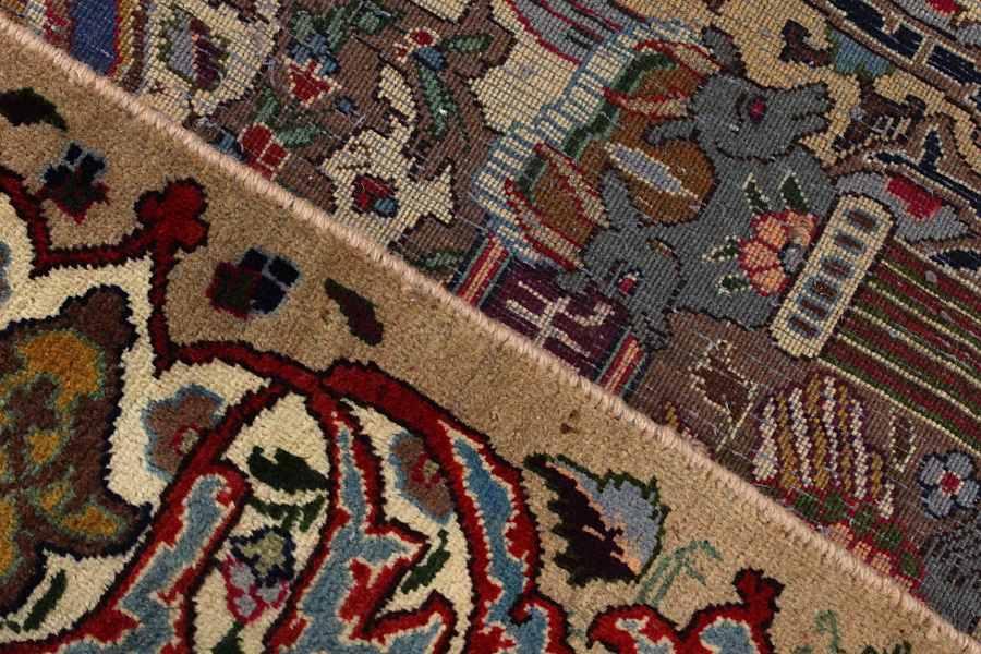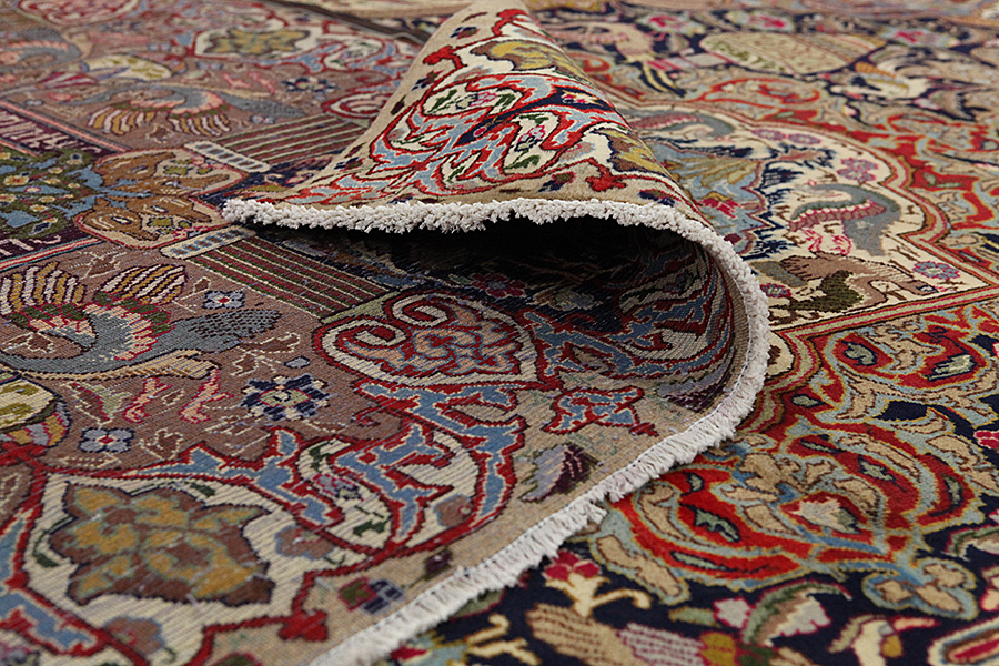 The city of Kashmar is located in the Khorasan province southwest of the city Mashad in Eastern Iran. Exquisite high quality rugs have been woven for centuries there. The rugs are woven thick, with fine soft wool in beautiful blue colours in contrast with cream and ivory beige. In newer rugs they use soft green, red and brown. Characteristic of Kashmar rugs are the large sizes and the unique designs that look like paintings with trees, flowers and domes of mosques.Also depicted are representations that recount historical events, major incidents from Persian history or a historically known person or the story of a revered Persian king. In Kashmar they weave elegant masterpieces of colour harmony, complexity of designs in detail, to show the Persian love of beauty and art. Kashmar rugs and rugs are durable and grow more beautiful with time.