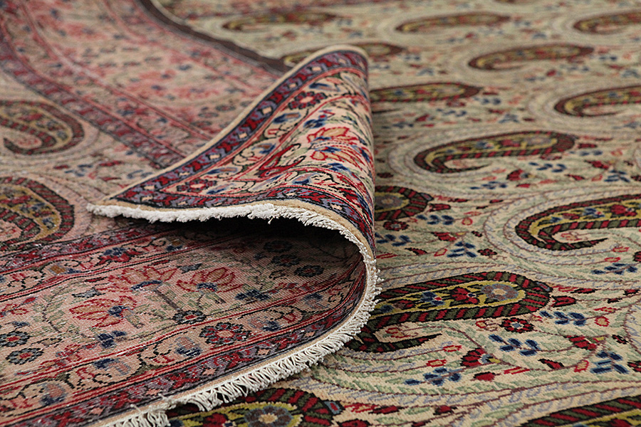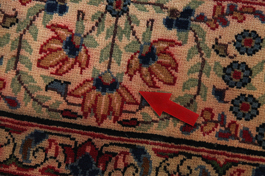 Abrash: Due to the different amount of grease in the wool and the added salt during the process of dyeing, the wool has got a varying colour absorbance. This is not very visible before weaving. During the weaving though, lines of the same colour are formed in the rug. This is called Abrash (which in Farsi means little cloud) and it shows that the wool was not manufactured using chemical means and marks the naturalness and authenticity of the rugs. Examples