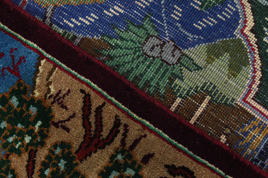 The city of Kashmar is located in the Khorasan province southwest of the city Mashad in Eastern Iran. Exquisite high quality rugs have been woven for centuries there. The rugs are woven thick, with fine soft wool in beautiful blue colours in contrast with cream and ivory beige. In newer rugs they use soft green, red and brown. Characteristic of Kashmar rugs are the large sizes and the unique designs that look like paintings with trees, flowers and domes of mosques.Also depicted are representations that recount historical events, major incidents from Persian history or a historically known person or the story of a revered Persian king. In Kashmar they weave elegant masterpieces of colour harmony, complexity of designs in detail, to show the Persian love of beauty and art. Kashmar rugs and rugs are durable and grow more beautiful with time.