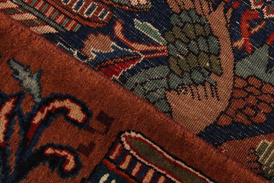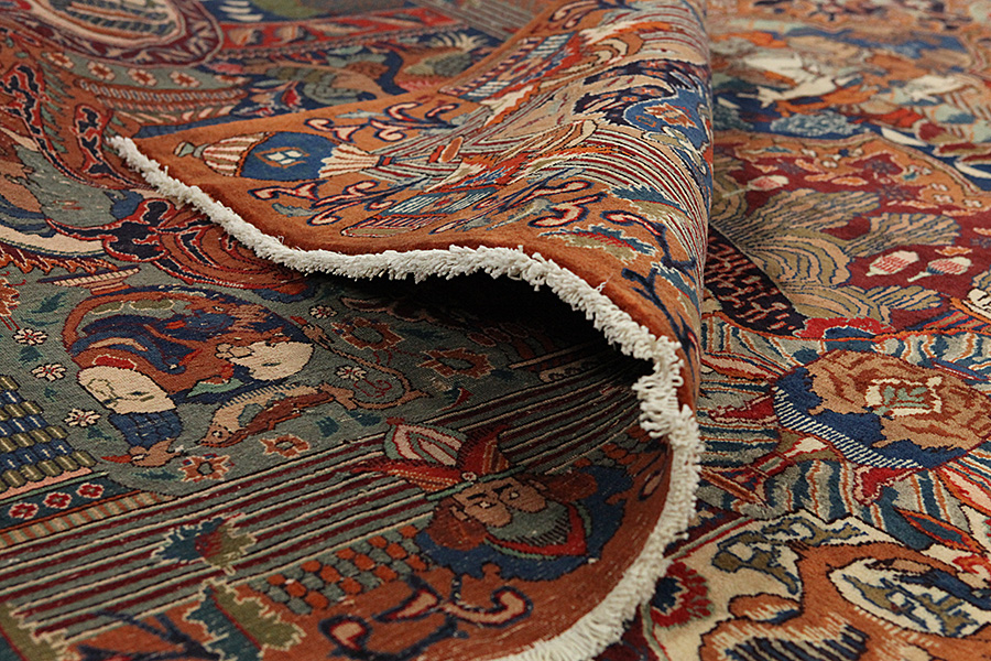The city of Kashmar is located in the Khorasan province southwest of the city Mashad in Eastern Iran. Exquisite high quality rugs have been woven for centuries there. The rugs are woven thick, with fine soft wool in beautiful blue colours in contrast with cream and ivory beige. In newer rugs they use soft green, red and brown. Characteristic of Kashmar rugs are the large sizes and the unique designs that look like paintings with trees, flowers and domes of mosques.Also depicted are representations that recount historical events, major incidents from Persian history or a historically known person or the story of a revered Persian king. In Kashmar they weave elegant masterpieces of colour harmony, complexity of designs in detail, to show the Persian love of beauty and art. Kashmar rugs and rugs are durable and grow more beautiful with time.
