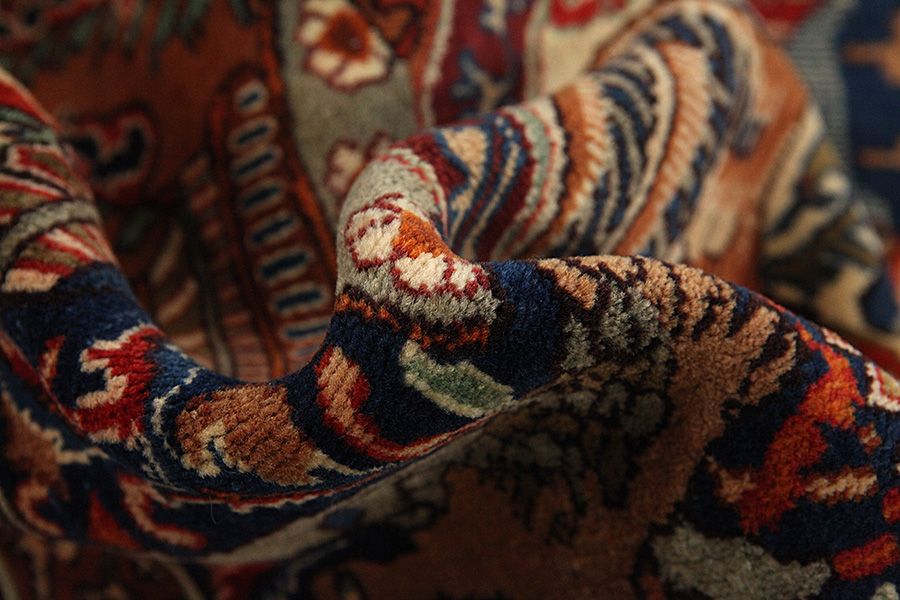 Abrash: Due to the different amount of grease in the wool and the added salt during the process of dyeing, the wool has got a varying colour absorbance. This is not very visible before weaving. During the weaving though, lines of the same colour are formed in the rug. This is called Abrash (which in Farsi means little cloud) and it shows that the wool was not manufactured using chemical means and marks the naturalness and authenticity of the rugs. Examples