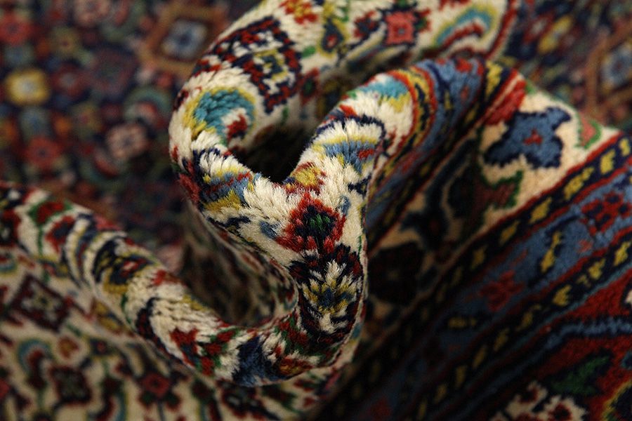 Abrash: Due to the different amount of grease in the wool and the added salt during the process of dyeing, the wool has got a varying colour absorbance. This is not very visible before weaving. During the weaving though, lines of the same colour are formed in the rug. This is called Abrash (which in Farsi means little cloud) and it shows that the wool was not manufactured using chemical means and marks the naturalness and authenticity of the rugs. Examples