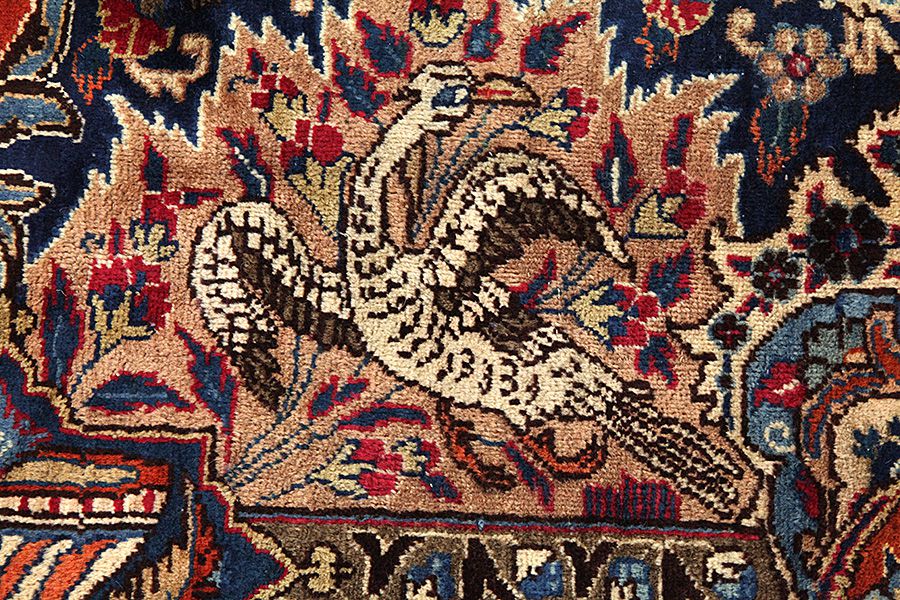 The city of Kashmar is located in the Khorasan province southwest of the city Mashad in Eastern Iran. Exquisite high quality rugs have been woven for centuries there. The rugs are woven thick, with fine soft wool in beautiful blue colours in contrast with cream and ivory beige. In newer rugs they use soft green, red and brown. Characteristic of Kashmar rugs are the large sizes and the unique designs that look like paintings with trees, flowers and domes of mosques.Also depicted are representations that recount historical events, major incidents from Persian history or a historically known person or the story of a revered Persian king. In Kashmar they weave elegant masterpieces of colour harmony, complexity of designs in detail, to show the Persian love of beauty and art. Kashmar rugs and rugs are durable and grow more beautiful with time.