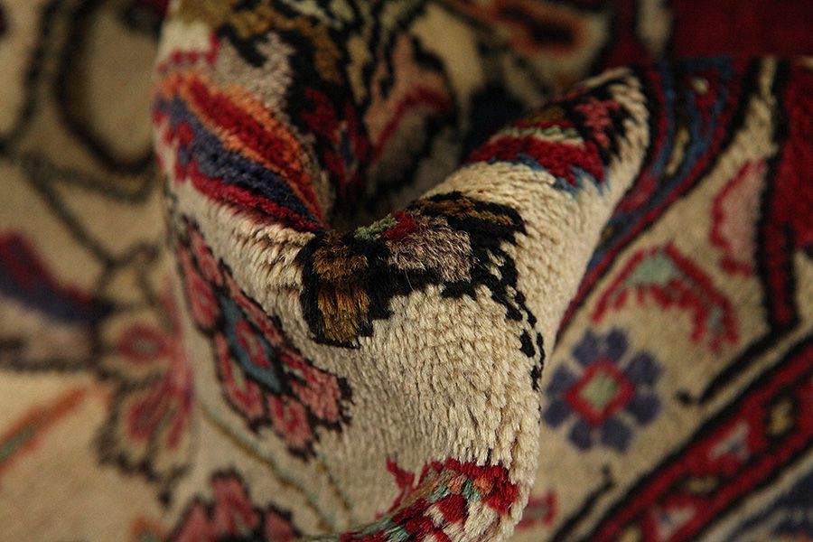 Abrash: Due to the different amount of grease in the wool and the added salt during the process of dyeing, the wool has got a varying colour absorbance. This is not very visible before weaving. During the weaving though, lines of the same colour are formed in the rug. This is called Abrash (which in Farsi means little cloud) and it shows that the wool was not manufactured using chemical means and marks the naturalness and authenticity of the rugs. Examples
