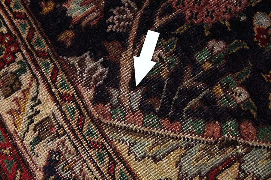 Abrash: Due to the different amount of grease in the wool and the added salt during the process of dyeing, the wool has got a varying colour absorbance. This is not very visible before weaving. During the weaving though, lines of the same colour are formed in the rug. This is called Abrash (which in Farsi means little cloud) and it shows that the wool was not manufactured using chemical means and marks the naturalness and authenticity of the rugs. Examples