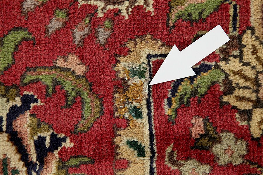 Abrash: Due to the different amount of grease in the wool and the added salt during the process of dyeing, the wool has got a varying colour absorbance. This is not very visible before weaving. During the weaving though, lines of the same colour are formed in the rug. This is called Abrash (which in Farsi means little cloud) and it shows that the wool was not manufactured using chemical means and marks the naturalness and authenticity of the rugs. Examples