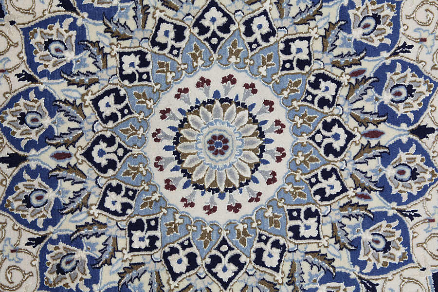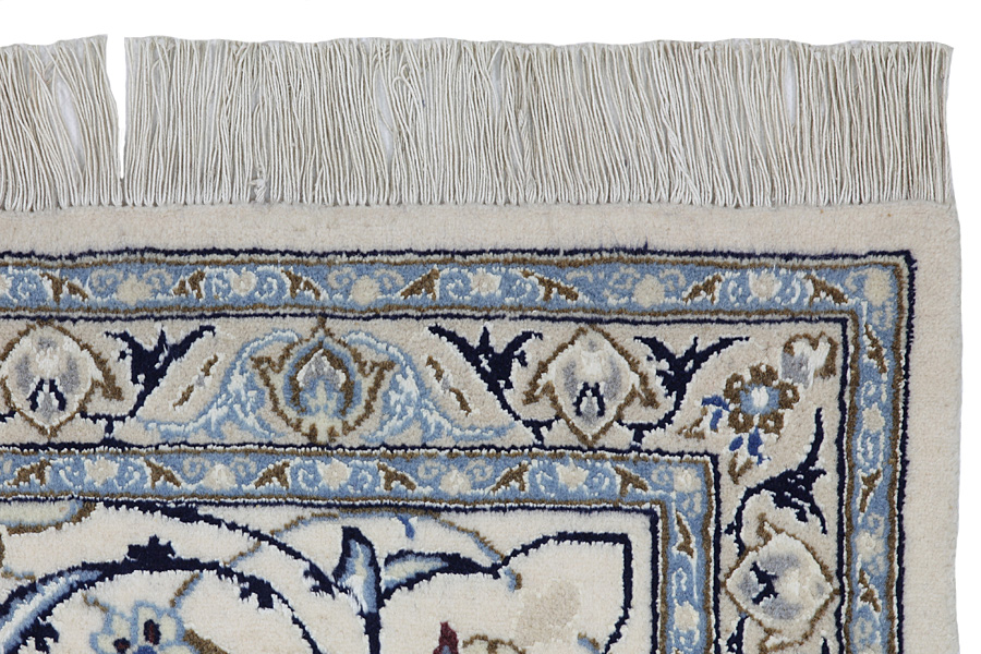 The warp in these rugs is typically of cotton. The warp consists of a number of threads that are referred to as "La". Nain 9la rugs are produced mostly in Khorasan, i.e. Kashmar and Mashhad. The high knot density and high class materials (wool and silk) establish Nain rugs and rugs as very high quality.