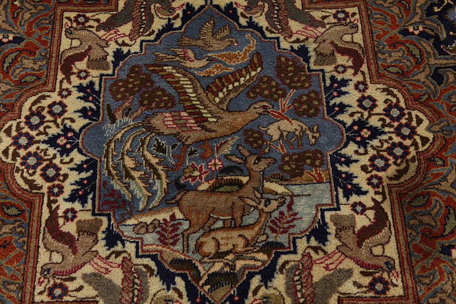 The city of Kashmar is located in the Khorasan province southwest of the city Mashad in Eastern Iran. Exquisite high quality rugs have been woven for centuries there. The rugs are woven thick, with fine soft wool in beautiful blue colours in contrast with cream and ivory beige. In newer rugs they use soft green, red and brown. Characteristic of Kashmar rugs are the large sizes and the unique designs that look like paintings with trees, flowers and domes of mosques.Also depicted are representations that recount historical events, major incidents from Persian history or a historically known person or the story of a revered Persian king. In Kashmar they weave elegant masterpieces of colour harmony, complexity of designs in detail, to show the Persian love of beauty and art. Kashmar rugs and rugs are durable and grow more beautiful with time.