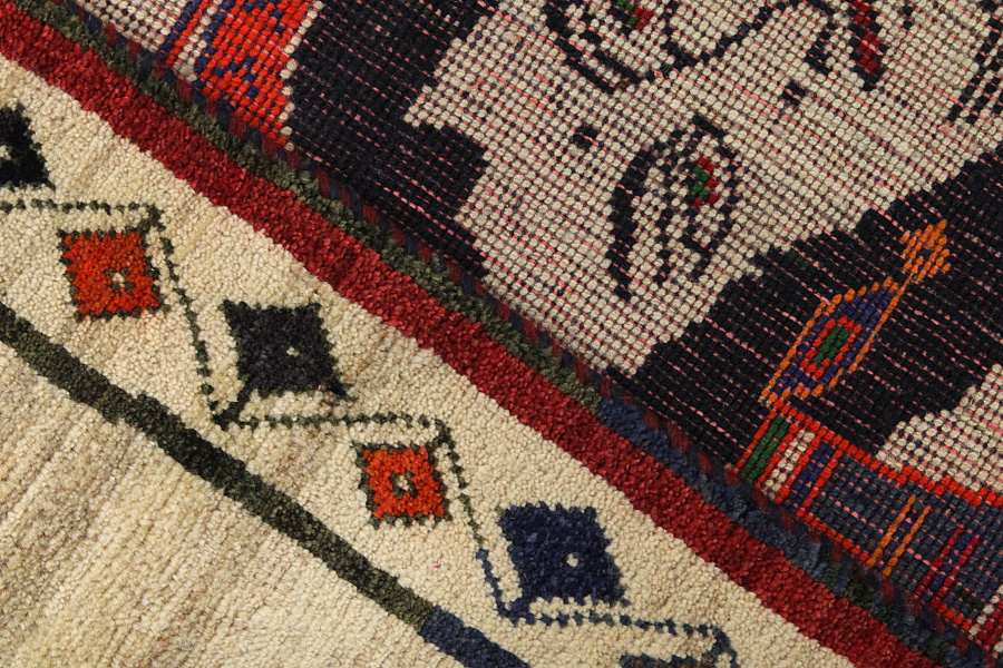 Gabbeh in Farsi means natural, primitive. Rugs and rugs with this name are woven by the nomads Qashqai who roam about, or in villages in Southwestern Iran where they live. The yarns are processed and twisted by hand, painted with herbal colours and woven with a wool warp up to 2 cm thick. These rugs are simple, with few designs, or monochrome. The simple, linear designs with animals and human figures give them a contemporary look. Various names are given to Gabbeh rugs such asBasic, Amalehbaft, Kashkooli, Luribaft and Sumak. Gabbeh Kashkooli is a rug with high knot density and thinner than ordinary Persian Gabbeh rugs. The Persian Gabbeh is very durable and its quality is very good.