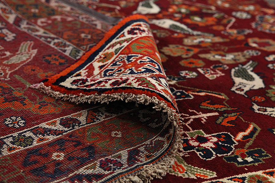 Qashqai rugs are woven by nomads who live in the mountainous areas of Southwest Persia, the provinces of Fars, Khuzestan, south of Isfahan and around the city Shiraz. Their rugs have a high knot density and a wide variety of designs, usually in deep red and blue colours. They weave rugs, Kilims and decorative textiles (ribbons, bags, etc.), which depict scenes from their lives with various representation of humans, animals, birds, trees and flowers.