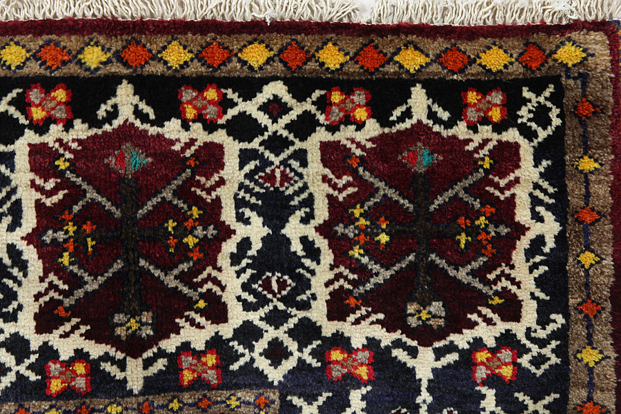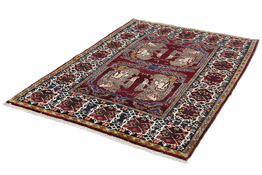 Rugs woven by the Lurs, a nomadic tribe in the mountainous Kurdish region of Southwest Iran, bordering Iraq. The Lori rugs usually have geometric shapes, often with rhombi and strictly linear scenes of the herbal and animal world. Because the areas where the Lurs live are inaccessible and isolated, they still weave with the old traditional ways, without influences from the Europeans. The centre of Luristan is Choremabad, which gave its name to the rugs woven there. Furthermore rugs have been named after the salt lake Neris.
