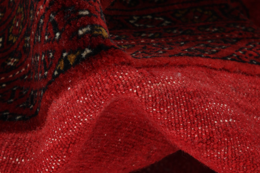 The Bokhara rugs are woven in Belutchistan and in different regions of Uzbekistan, Turkmenistan and Afghanistan. Turkmen rugs include Basjir, Salor, Tekke-Bochara, Jolam-Bocharaband, Ersari, Tjaudor and Yomut which are examples of the rug style called Bokhara. The deep red and the whole range of red from purple to brown are the dominant colours with repeating octagons, rhombi, yomut motifs being characteristic of these rugs. The warp of the rugs is always wool.