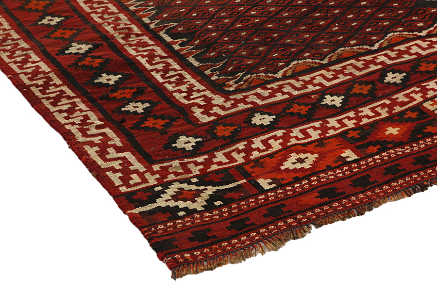 The Turkaman rugs are being woven in several regions of Uzbekistan, Turkmenistan, eastern Turkestan, Afghanistan and Belutschistan. Basjir, Salor, Τekke-Bochara, Jolam-Bocharaband, Ersar, Tjaudor and Yomut rugs, which are characteristicexamples of the Bokhara techniques, belong to the category of the Turkaman rugs. Deep red and different tones of red, even purple or brown are their principal colours. Their main rugs designs include repeated octagonal, rhombi, the motifs gul and yomut. Their warp is woolen.