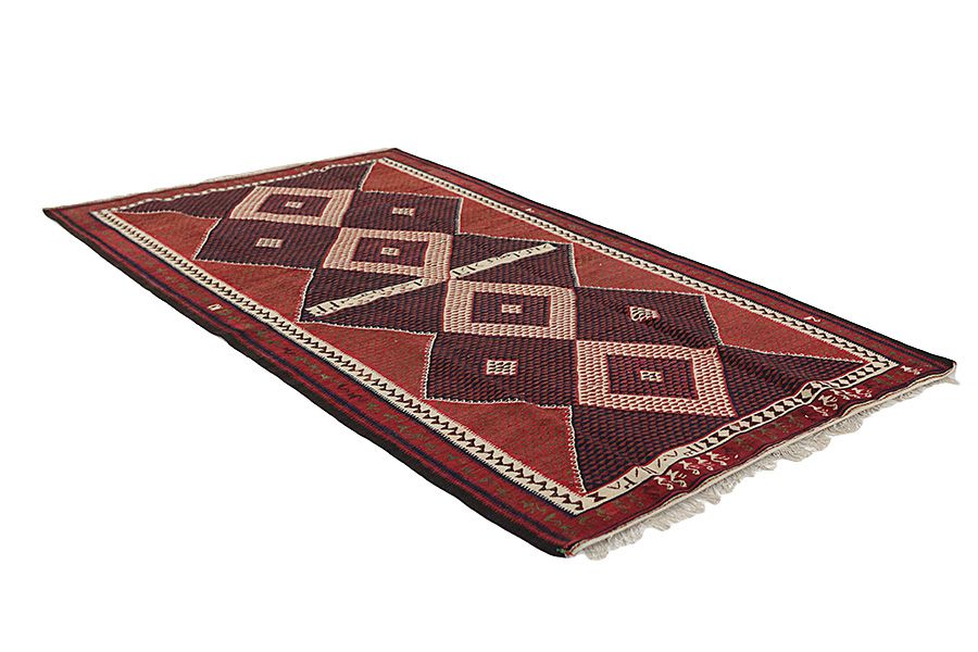 This is a particular type of Oriental flat woven rug without a pile (which preceded the pile rug) and is manufactured mainly by nomads in Persia, Afghanistan, Turkey and in various regions of the Caucasus. These textiles are rather small with a plain weave and no pile and they have got geometric patterns and rich colours. In order to weave them, natural materials like wool are used and sometimes silk for lightweight and delicate rugs. The colouring of yarns is done with plants and minerals that contribute to natural, beautiful colours. The long history of Kilim rugs goes back centuries to the nomads of Central Asia. Initially the rugs were mainly used in households and much later became commercial products, following the bloom of the oriental ruging during the 16th and 17th century. They have many applications and can be used on the floor, as toppings or for decorating walls. The name kilim is derived from the Persian word gelim. In Kurdish they are called Berr. The most famous Persian rugs are Sumakh, Senneh, Fars and Qashqai. Many Kilims are also woven at the border between Persia and Afghanistan by the nomads of Balouch with dark earthy indicative colours.