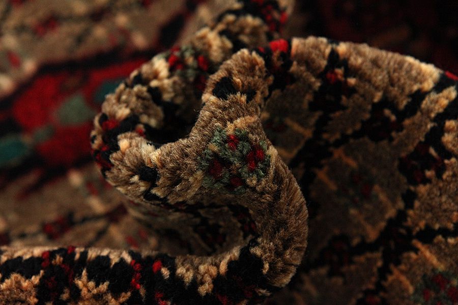 Abrash: Due to the different amount of grease in the wool and the added salt during the process of dyeing, the wool has got a varying colour absorbance. This is not very visible before weaving. During the weaving though, lines of the same colour are formed in the rug. This is called Abrash (which in Farsi means little cloud) and it shows that the wool was not manufactured using chemical means and marks the naturalness and authenticity of the rugs. Examples