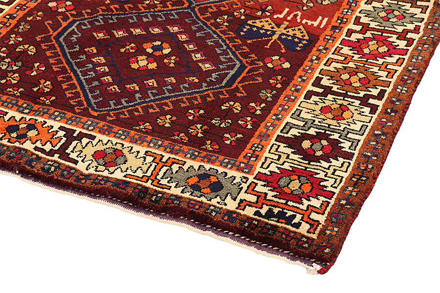 Rugs woven by the Lurs, a nomadic tribe in the mountainous Kurdish region of Southwest Iran, bordering Iraq. The Lori rugs usually have geometric shapes, often with rhombi and strictly linear scenes of the herbal and animal world. Because the areas where the Lurs live are inaccessible and isolated, they still weave with the old traditional ways, without influences from the Europeans. The centre of Luristan is Choremabad, which gave its name to the rugs woven there. Furthermore rugs have been named after the salt lake Neris.
