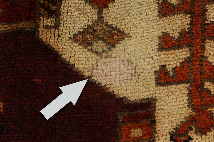 Abrash: Due to the different amount of grease in the wool and the added salt during the process of dyeing, the wool has got a varying colour absorbance. This is not very visible before weaving. During the weaving though, lines of the same colour are formed in the rug. This is called Abrash (which in Farsi means little cloud) and it shows that the wool was not manufactured using chemical means and marks the naturalness and authenticity of the rugs. Examples