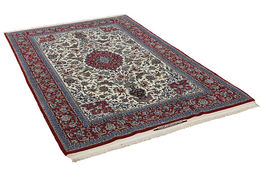 In the centre of Iran among the Zagros Mountains and the desert, lies the city of Isfahan. Nowadays it is an important industrial city with a population of 1.2 million. The town is an architectural masterpiece. The old rugs of Isfahan incontrast with the newer ones didn't have got a central medallion. The entire surface of the rug was filled with elaborate spiral flowers and flower palmettes. The newer Isfahan rugs cannot be compared with those wonderful old specimens which were manufactured exclusively for nobles. But continuing the tradition, today's rugs of Isfahan also have a very fine weave and are clipped very short to reveal their design more clearly. In the weaving they also use silk to highlight certain areas of the design, especially in flowers. The warp is made of silk or cotton.