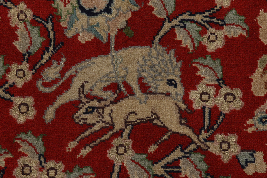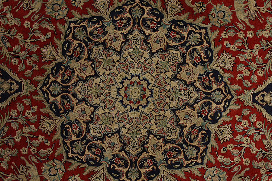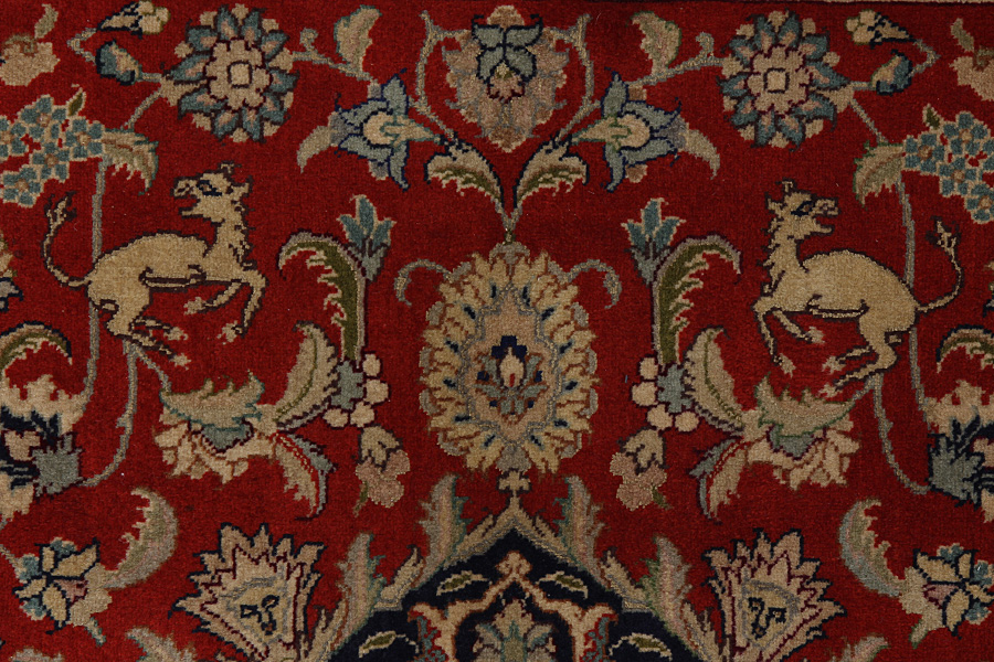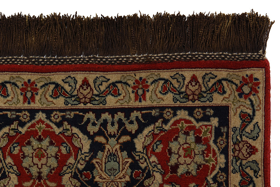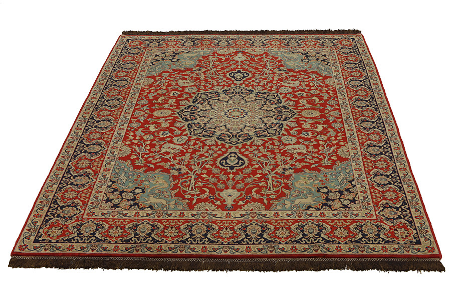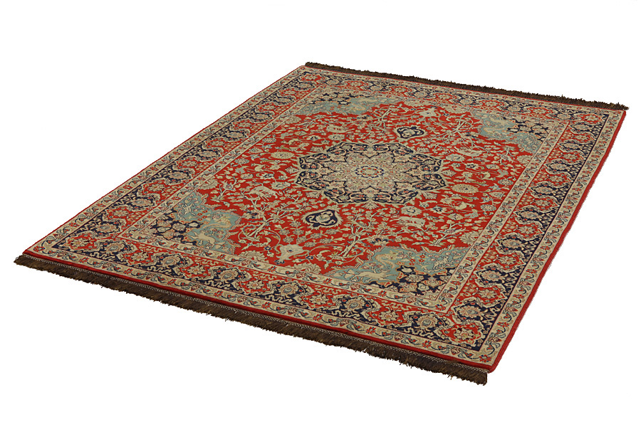 In the centre of Iran among the Zagros Mountains and the desert, lies the city of Isfahan. Nowadays it is an important industrial city with a population of 1.2 million. The town is an architectural masterpiece. The old rugs of Isfahan incontrast with the newer ones didn't have got a central medallion. The entire surface of the rug was filled with elaborate spiral flowers and flower palmettes. The newer Isfahan rugs cannot be compared with those wonderful old specimens which were manufactured exclusively for nobles. But continuing the tradition, today's rugs of Isfahan also have a very fine weave and are clipped very short to reveal their design more clearly. In the weaving they also use silk to highlight certain areas of the design, especially in flowers. The warp is made of silk or cotton.