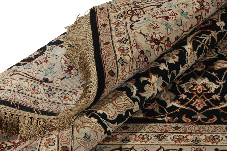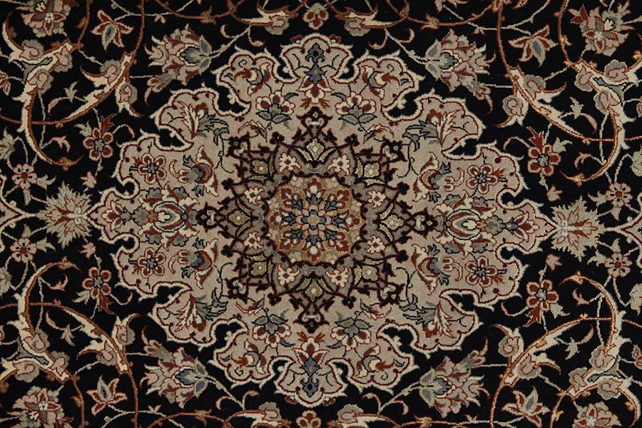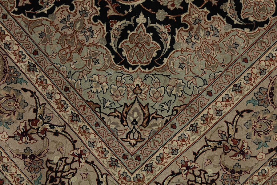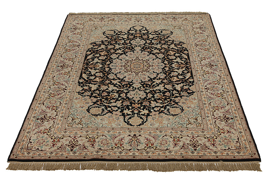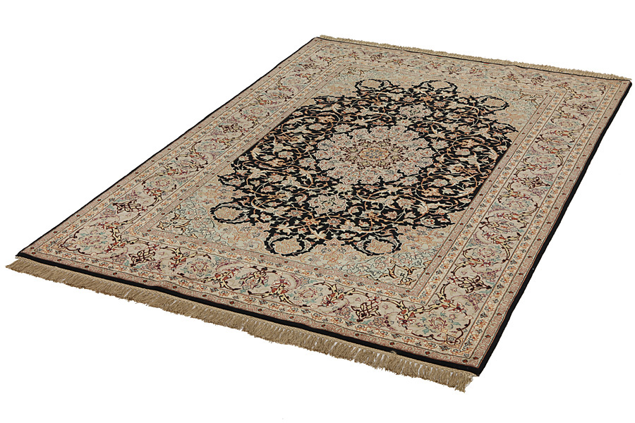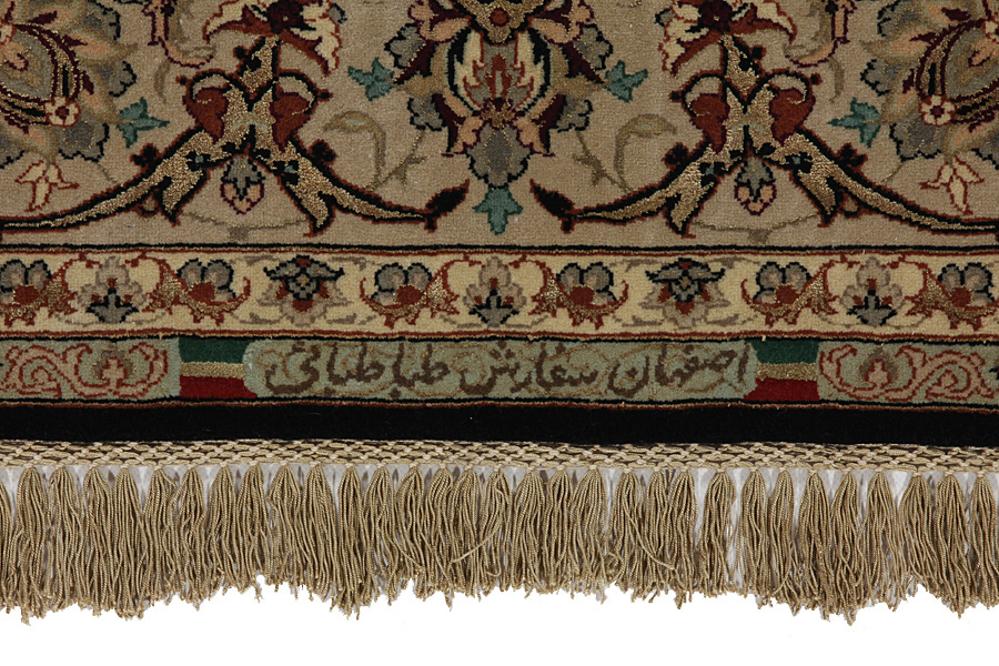 In the centre of Iran among the Zagros Mountains and the desert, lies the city of Isfahan. Nowadays it is an important industrial city with a population of 1.2 million. The town is an architectural masterpiece. The old rugs of Isfahan incontrast with the newer ones didn't have got a central medallion. The entire surface of the rug was filled with elaborate spiral flowers and flower palmettes. The newer Isfahan rugs cannot be compared with those wonderful old specimens which were manufactured exclusively for nobles. But continuing the tradition, today's rugs of Isfahan also have a very fine weave and are clipped very short to reveal their design more clearly. In the weaving they also use silk to highlight certain areas of the design, especially in flowers. The warp is made of silk or cotton.