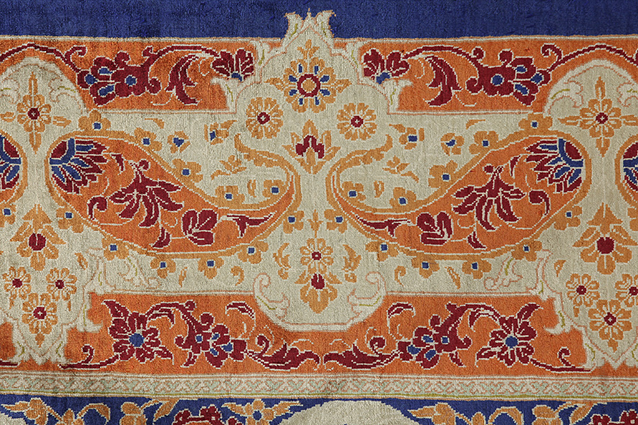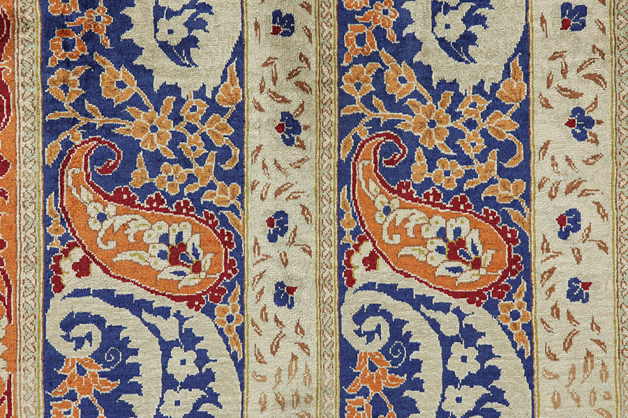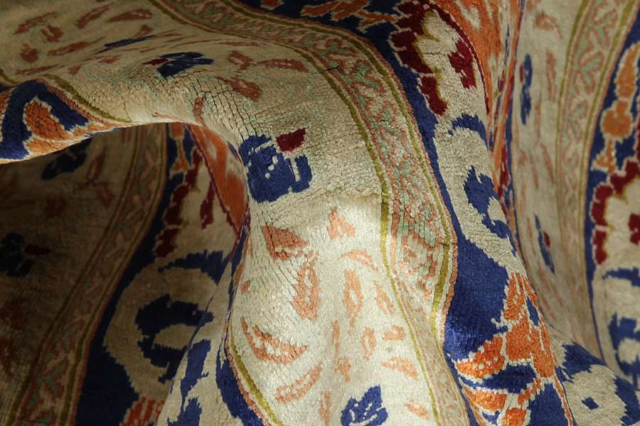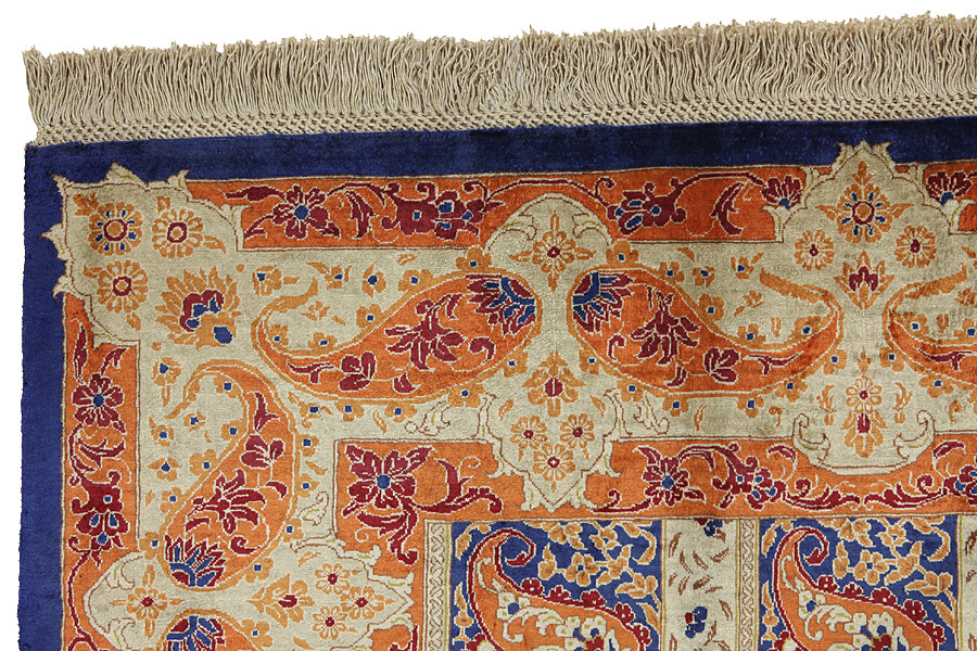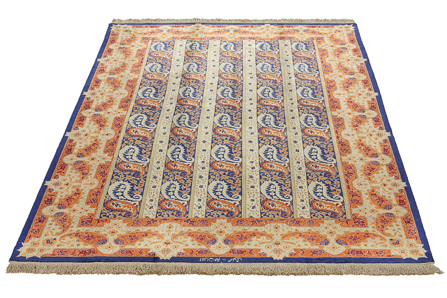 Qum or Ghom is an Iranian city that is regarded as holy by the Shiites. The weaving of Qum rugs began on a large scale in the 1930's and they have experimented with various designs of old rugs such as Senna, Kashan, Isfahan and other renowned Persian rugs. A new generation of designers created new designs with rare colours for Persian rugs, like light green and turquoise-blue. This way Qum silk rugs developed an original character of their own. Among the many famous projectsis the Garden: a design with several repeated blocks, within which are depicted flowers or animals (images of birds, winged lions, and dragons), old Persian hunting representations or various historical scenes. Prayer rugs with various religious themes are also well known. The rugs have a high knot density and high class materials. Silk and fine quality wool establish them as very high quality rugs.