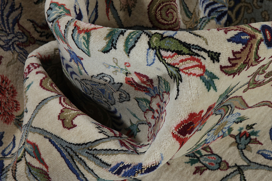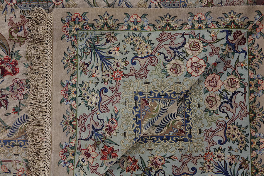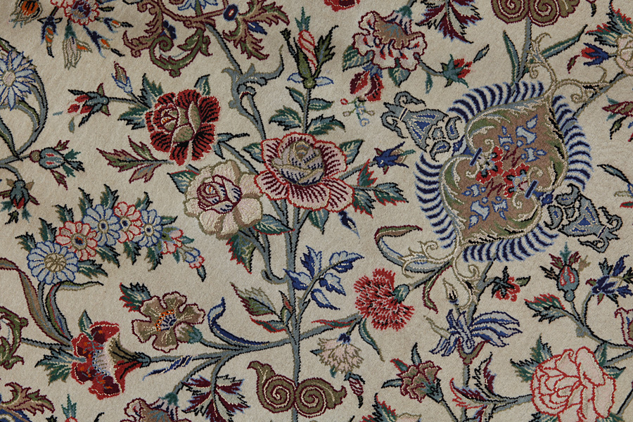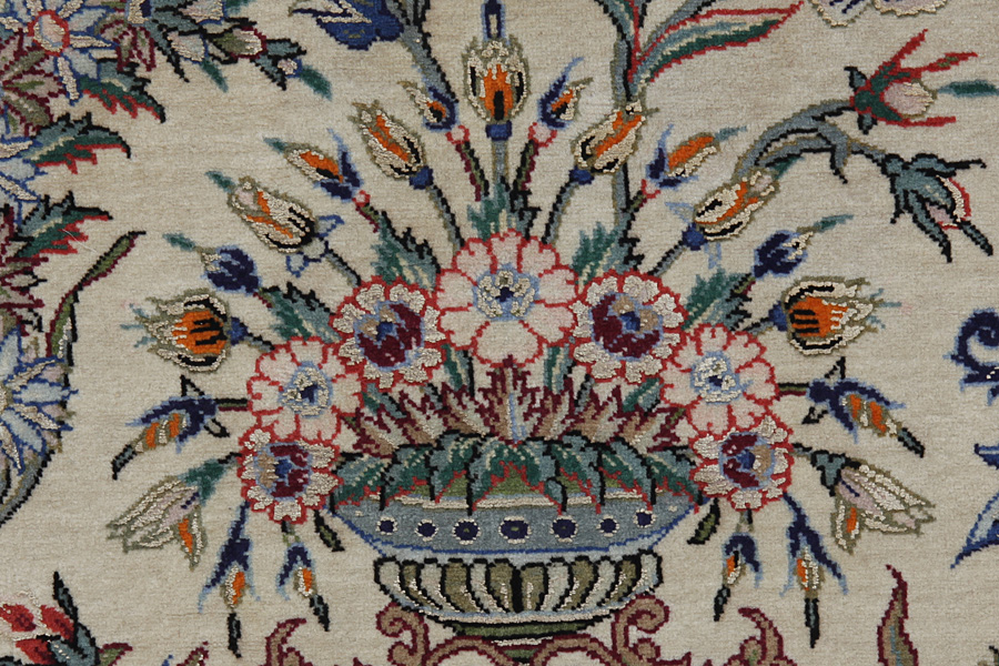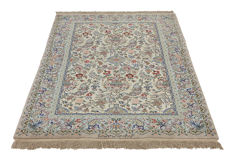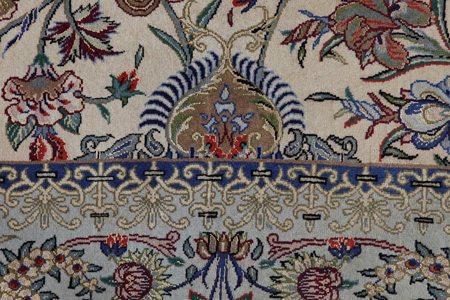 In the centre of Iran among the Zagros Mountains and the desert, lies the city of Isfahan. Nowadays it is an important industrial city with a population of 1.2 million. The town is an architectural masterpiece. The old rugs of Isfahan incontrast with the newer ones didn't have got a central medallion. The entire surface of the rug was filled with elaborate spiral flowers and flower palmettes. The newer Isfahan rugs cannot be compared with those wonderful old specimens which were manufactured exclusively for nobles. But continuing the tradition, today's rugs of Isfahan also have a very fine weave and are clipped very short to reveal their design more clearly. In the weaving they also use silk to highlight certain areas of the design, especially in flowers. The warp is made of silk or cotton.