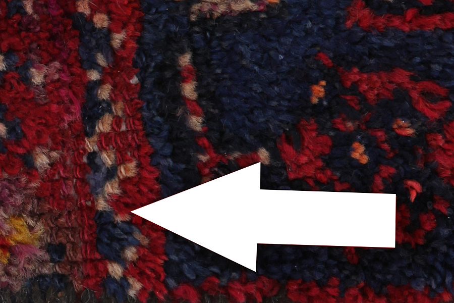 Abrash: Due to the different amount of grease in the wool and the added salt during the process of dyeing, the wool has got a varying colour absorbance. This is not very visible before weaving. During the weaving though, lines of the same colour are formed in the rug. This is called Abrash (which in Farsi means little cloud) and it shows that the wool was not manufactured using chemical means and marks the naturalness and authenticity of the rugs. Examples