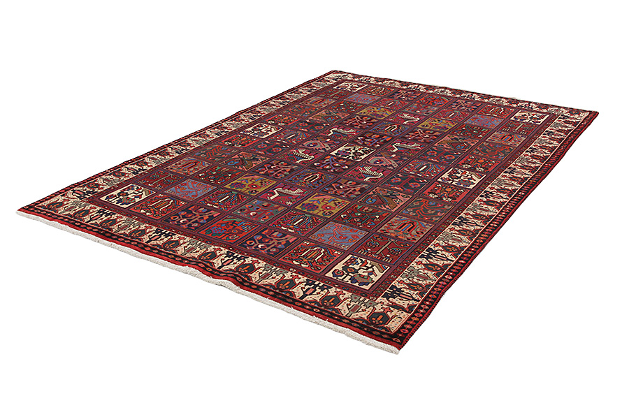 In the mountains Zagros, west of the city of Isfahan, around the town of Shahr-e-Kurd, live the nomads Bakhtiar. Their rugs are known for the design with various repeating squares in which flowers and animals are depicted. For this reason the design is called "garden"(Khesti). Their rugs are very durable with a dense weave and very good quality Persian wool coming from sheep grazing at a high altitude. The best Bakhtiari rugs with highest knot density are often called Bibibaff.