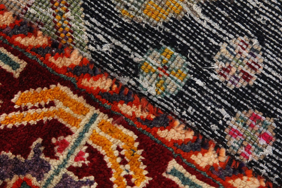 Abrash: Due to the different amount of grease in the wool and the added salt during the process of dyeing, the wool has got a varying colour absorbance. This is not very visible before weaving. During the weaving though, lines of the same colour are formed in the rug. This is called Abrash (which in Farsi means little cloud) and it shows that the wool was not manufactured using chemical means and marks the naturalness and authenticity of the rugs. Examples